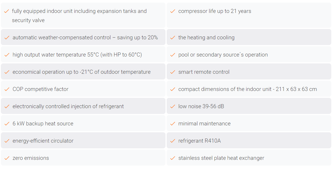 The NeoRé F TX heat pump consists of a quality Czech indoor unit and Japanese Fujitsu outdoor unit. It is a fully equipped heat pump which contains 200 l integrated stainless steel DHW tank. Except house heating and DHW heating it can control a secondary source (for example pool) as well. These heat pumps could be installed to the new family houses as well as built houses where it prefectly combines the useful value of the heat source with the design.