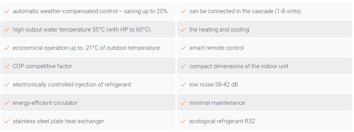 Inverter NeoRé TG MINI heat pumps belong to air-to-water heat pump category that means they use thermal energy from the air and transfer it to the heating water in heating system. The heating system ideally consists of underfloor or ceiling heating with which is the efficiency of heating system on the top level. You can combine it also with radiators but there is the efficiency lower because of high temperature decay.